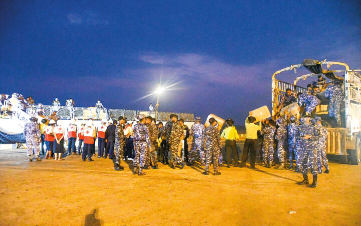Indian naval vessels carried instant noodles, fortified nutritious biscuits, plastic buckets, plastic cups, personal hygiene materials, tents, tarpaulin sheets, clothes, sanitation equipment and medicines, weighing some 40 tonnes.