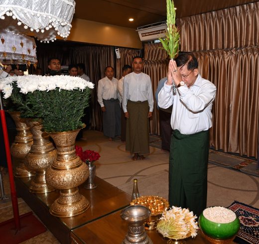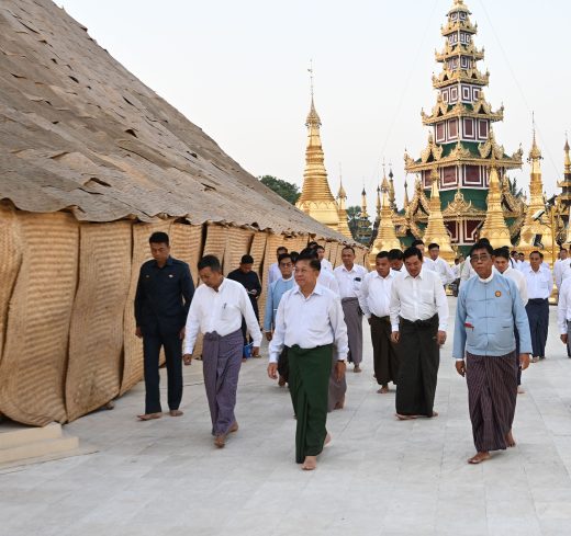 He inspected the progress of offering gold foils to the whole structure of the pagoda and maintenance works. He also donated jewellery items, gold and religious objects to the pagoda and sprinkled scented water. From the scaffolding, the Senior General viewed urban development scenes of Yangon City and instructed officials to continuously carry out the beautification of the city.
