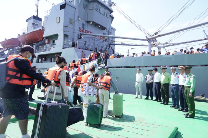 Of the returnees from Cambodia, 543 citizens repatriated by Tatmadaw aircraft to Myeik boarded Tatmadaw vessels from Seiknage jetty in Myeik. They were then transferred to Tatmadaw vessel (Mottama) waiting near Mawtongyi village in Kyunsu Township. Commander of the Coastal Region Command Maj-Gen Kyaw Kyaw Han, along with officials and departmental representatives from Myeik district and township levels, observed the repatriation processes.