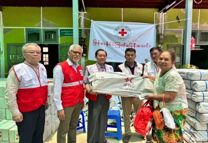 Myanmar Red Cross Society President Professor Dr Myo Nyunt and Mr Jagannath Chapagain, General Secretary of the International Federation of Red Cross and Red Crescent Societies (IFRC), along with Executive Committee Member Professor Dr Tin Maung Hlaing, IFRC Myanmar Country Representative Ms Nadia Khoury, Chairpersons of the Red Cross Supervisory Committees in Sagaing and Mandalay Regions, Directors of the Project Management Unit and the Disaster Management Department and other responsible officials visited earthquake victims in Sagaing on 9 May.