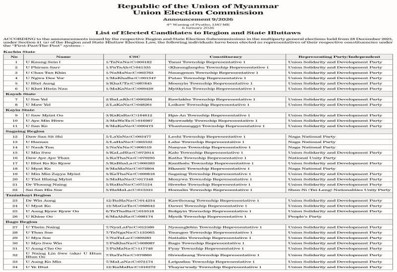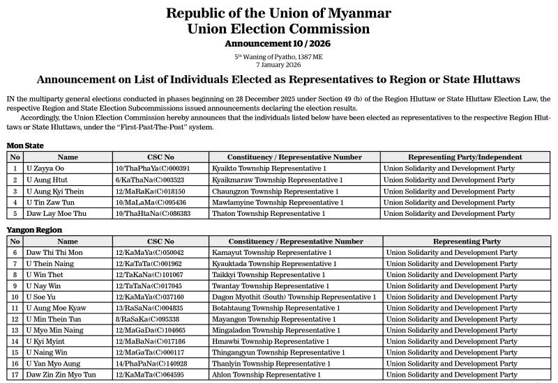 In the multiparty general elections conducted in phases beginning on 28 December 2025 under Section 49 (b) of the Region Hluttaw or State Hluttaw Election Law, the respective Region and State Election Subcommissions issued announcements declaring the election results.