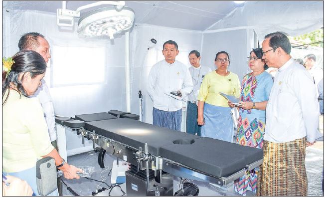 The Union minister and his team visited the Central Medical Store Depot in Yangon, where they inspected the temporary storage of 95 Mobile Operation Rooms (MOR) worth approximately 32 million yuan, donated by the People’s Republic of China for post-earthquake reconstruction in Mandalay, reviewed an operation theatre equipped with a model, and instructed their timely transport to hospitals in disaster-prone states and regions, emphasizing systematic maintenance upon arrival.