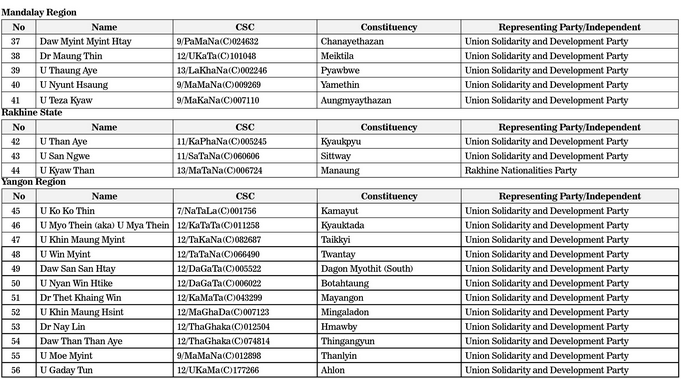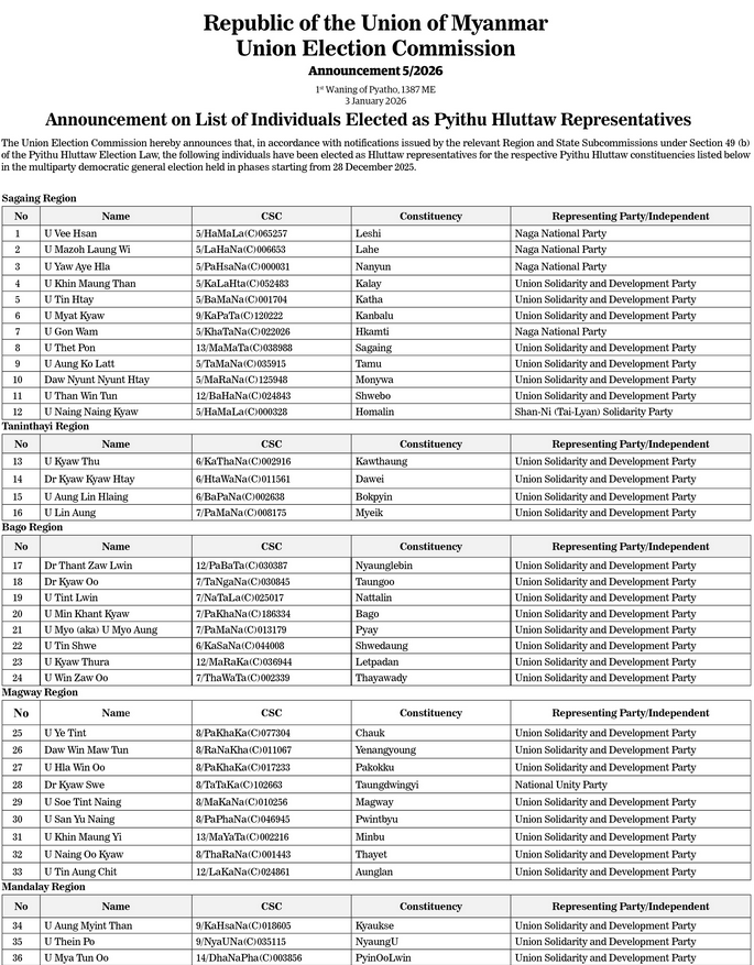 The Union Election Commission hereby announces that, in accordance with notifications issued by the relevant Region and State Subcommissions under Section 49 (b) of the Pyithu Hluttaw Election Law, the following individuals have been elected as Hluttaw representatives for the respective Pyithu Hluttaw constituencies listed below in the multiparty democratic general election held in phases starting from 28 December 2025.