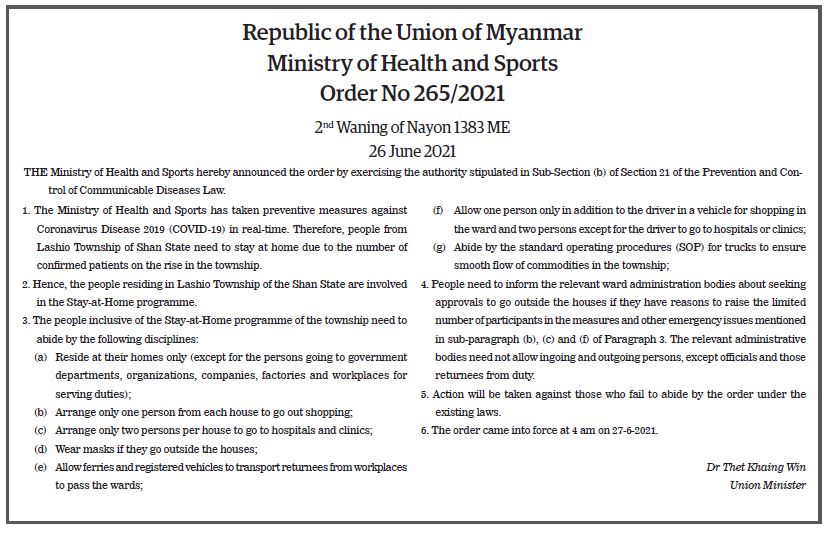 Submitted by moiuser on 27 June 2021 Republic of the Union of Myanmar Ministry of Health and Sports Order No 265/2021 #TheGlobalNewLightOfMyanmar
