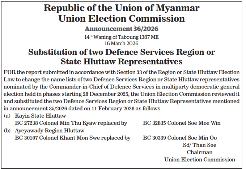 Republic of the Union of Myanmar Union Election Commission Announcement 36/2026