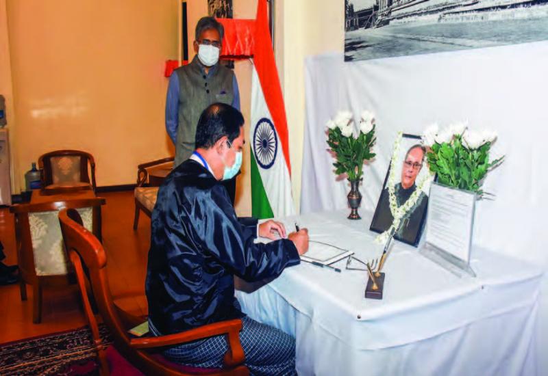 DIRECTOR-General U Aung Myint from the Strategic Studies and Training Department of the Ministry of Foreign Affairs yesterday afternoon signed the book of condolences at the Indian Embassy in Yangon for the demise of former Indian President Shri Pranab Mukherjee.