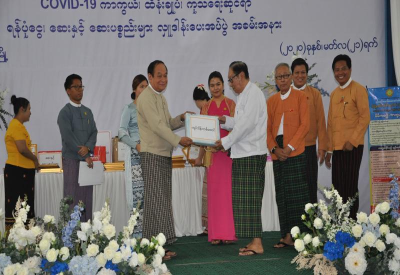 UNION Minister for Health and Sports Dr Myint Htwe attended the ceremony to donate cash, medical equipment and medicines to Central Committee on Prevention, Control and Treatment of 2019 Novel Coronavirus (2019-COVID) and the Ministry of Health and Sports yesterday in Yangon.