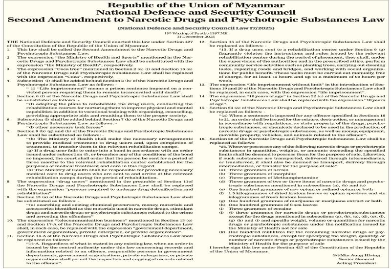 The following is congratulatory message from Foreign Head of State/Government sent to Acting President of the Republic of the Union of Myanmar Senior General Min Aung Hlaing on the occasion of the 78th Anniversary of Independence Day of the Republic of the Union of Myanmar.