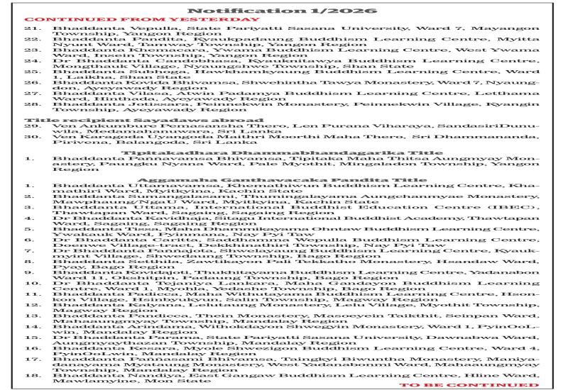 The Union Election Commission hereby announces that, in accordance with notifications issued by the relevant Region and State Subcommissions under Section 49 (b) of the Pyithu Hluttaw Election Law, the following individuals have been elected as Hluttaw representatives for the respective Pyithu Hluttaw constituencies listed below in the multiparty democratic general election held in phases starting from 28 December 2025.
