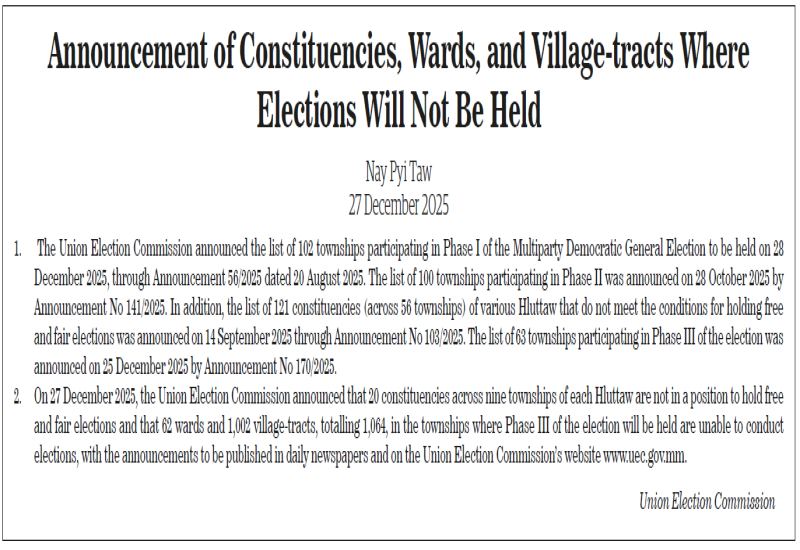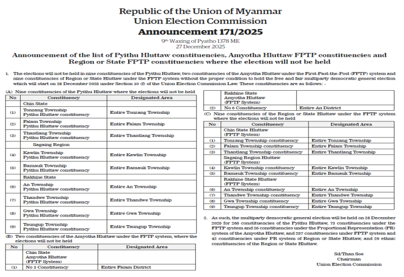 Announcement of the list of Pyithu Hluttaw constituencies, Amyotha Hluttaw FPTP constituencies and Region or State FPTP constituencies where the election will not be held Announcement 171/2025