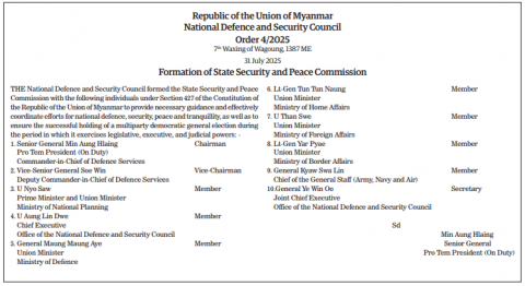 Submitted by moiuser3 on 1 August 2025 Republic of the Union of Myanmar National Defence and Security Council Order 4/2025