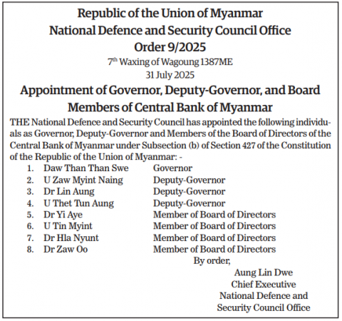 Submitted by moiuser3 on 1 August 2025 Republic of the Union of Myanmar National Defence and Security Council Office Order 9/2025