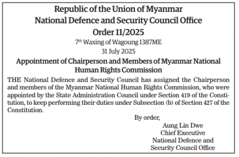 Submitted by moiuser3 on 1 August 2025 Republic of the Union of Myanmar National Defence and Security Council Office Order 11/2025