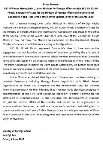 H.E. U Wunna Maung Lwin , Union Minister for Foreign Affairs receive H.E. Dr. KUNG Phoak, Secretary of State for the Ministry of Foreign Affairs and International Cooperation and Head of the office of the Special Envoy of the ASEAN Chair