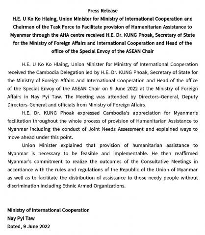H.E. U Ko Ko Hlaing, Union Minister for Ministry of International Cooperation and Chairman of the Task Force to Facilitate provision of Humanitarian Assistance to Myanmar through the AHA centre received H.E. Dr. KUNG Phoak, Secretary of State for the Ministry of Foreign Affairs and International Cooperation and Head of the office of the Special Envoy of the ASEAN Chair