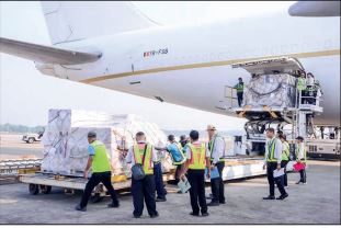 A Rom Cargo Airline plane carrying UNICEF Myanmar relief supplies for earthquake-affected people arrived at Yangon International Airport yesterday morning.