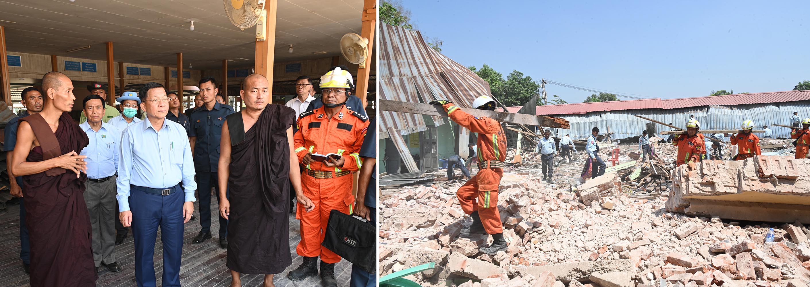 The Senior General viewed the removal of debris and rescue measures at the collapsed Dhammayon of Khemathiwun Monastery in Pyinmana, gave necessary guidance to officials and encouraged the rescue teams.
