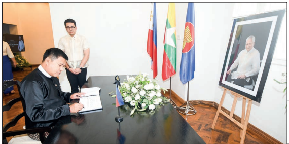 YESTERDAY afternoon, at the embassy of the Republic of the Philippines in Pho Sein Road, Bahan Township, Director-General of the Strategic Studies and Training Department of the Ministry of Foreign Affairs U Zaw Phyo Win formally signed the Book of condolences for the demise of Honorable Albert F Del Rosario, former Secretary of Foreign Affairs of the Republic of the Philippines, who passed away on 18 April 2023.