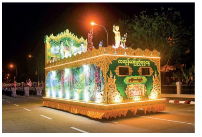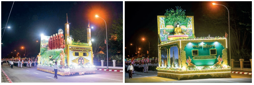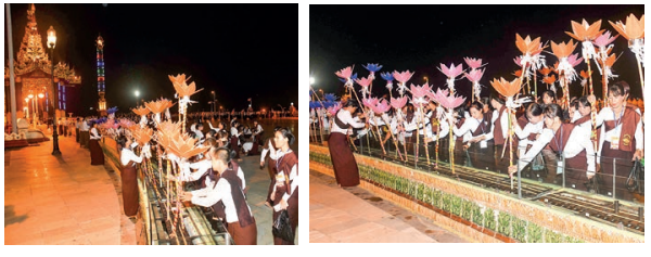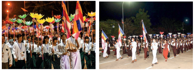 First, they gathered at the Tabaung compound and the students in the Byadate vehicle that depicts (seeking to prophesy of Buddha) holding Sasana flags and lit candles took positions in front of the eastern way of the pagoda while the ministries’ staff in the Phwa vehicle (birth of Buddha) at the northern way of the pagoda, the students in the Pwint vehicle (attained Enlightenment) at the western way of the pagoda and the ministries’ staff in San vehicle (Parinirvana of Buddha) at the southern way of the pagoda holding flags and lit candles in their hands.