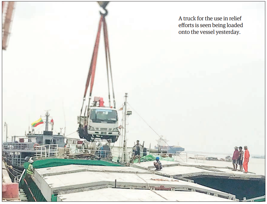 Similarly, MV MCL 5 watercraft owned by MCL Company Limited docked at Bo Aung Kyaw, Yangon Region carrying various hardwoods, foodstuffs and relief items totalling 2,400 metric tons left for Sittway on the same day.