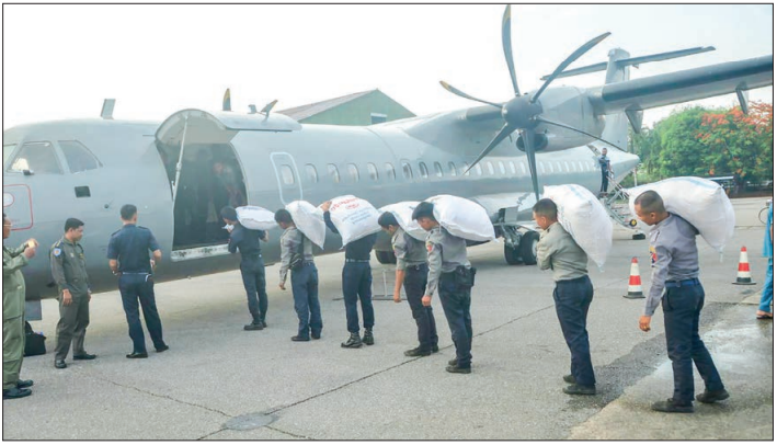 Tatmadaw aircraft transported 4.364 tonnes of relief materials, including uniforms and books, for schools in disaster-affected areas from Yangon’s Mingaladon Airport to Sittway Airport.