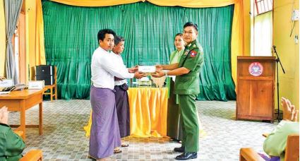 While in Kyaukpyu, he inspected the ongoing dredging operations to clear blocked drains in Asoeya Ward. Additionally, at a ceremony held at the Township General Administration Department, where cash was donated to the fund for repairing religious schools and buildings damaged by the storm, Lt-Gen Lu Aye presented financial aid to the relevant village administrators and members of the board of trustees.