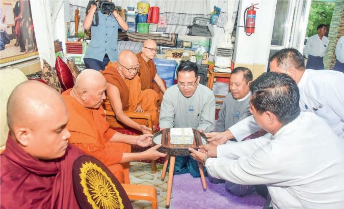 First, the Union minister and party donated cash and day meal to Sayadaw Bhaddanta Nyaninda of Sama Hill Maha Parahita Youth Development Home and shared merits.