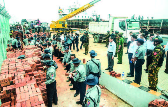 The Vice-Senior General and party first visited the Kaladan Multi-Modal Port of Sittway, where they inspected the arrival of cargo ships carrying relief items and rehabilitation materials intended for the storm-affected population. They also observed the transport of these essential supplies to support the rescue teams on the ground.
