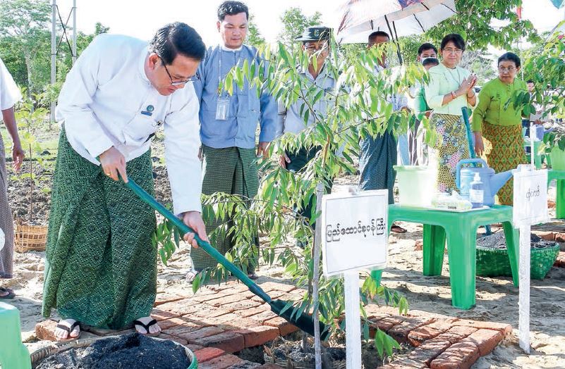 UNION Minister for Information U Maung Maung Ohn and wife grew Mesua ferrea and Star-flower plants at the designated locations and Deputy Minister U Ye Tint, departmental heads and officials also planted teak, mahogany, star-flower and gum-kino at the respective sites at the 2023 monsoon tree-growing in the compound of MRTV in Tatkon yesterday.