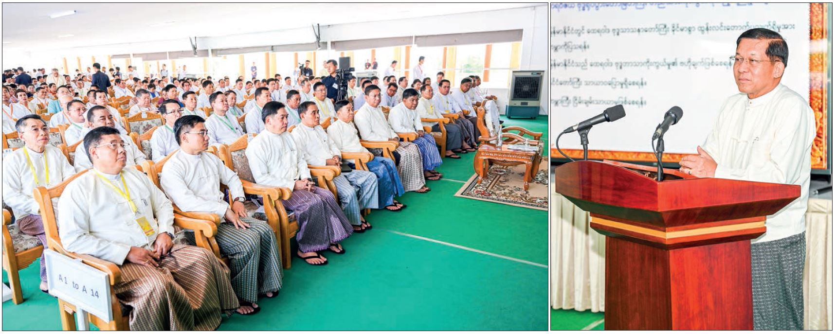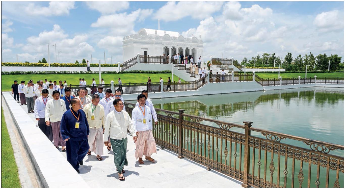 Speaking on the occasion, the Senior General explained that Maravijaya Buddha image is being carved with Bhumi Phassa mudra of Yadanabon era. Marble rocks weighing 7,632 tonnes from Sagyin Hill to Nay Pyi Taw were conveyed seven times starting from 3 July 2020. Advice was sought from State Sangha Maha Nayaka Committee member Sayadaws for carving the Buddha image. In line with the advice, Tri Pitakat treatises were carved on stone plaque in Pali and Rmoanized languages in Maravijaya Buddha Park.