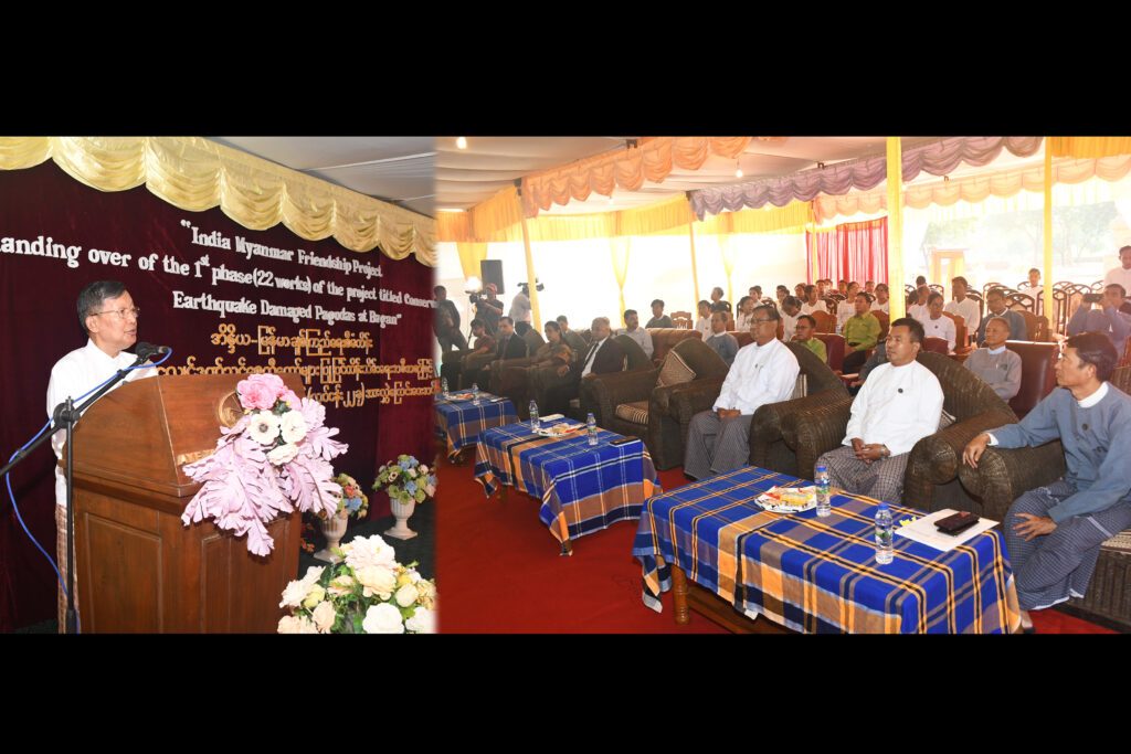 At noon, the Union minister attended the “handing over of 1st (22 works) of the project titled Conservation of 11 Earthquake Damaged Pagodas at Bagan”. It is the India-Myanmar friendship project initiated by ASI of India.