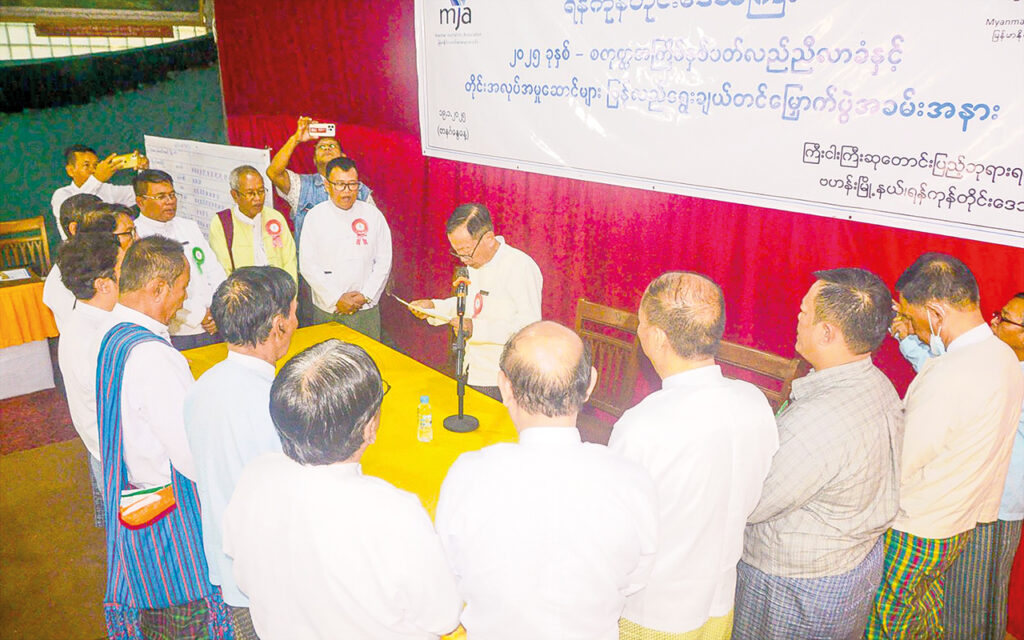Yangon Region MJA Chairman U Khin Maung Myint and Myanmar Journalists Association (Central) Chairman U Myat Khaing delivered opening speeches. Vice-Chairman U Thet Tin presented a report on activities undertaken during the third term. Joint Secretary 1 U Tin Win explained the arrangements for electing the executive committee for the fourth term.
