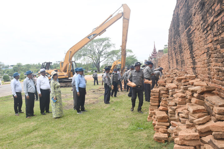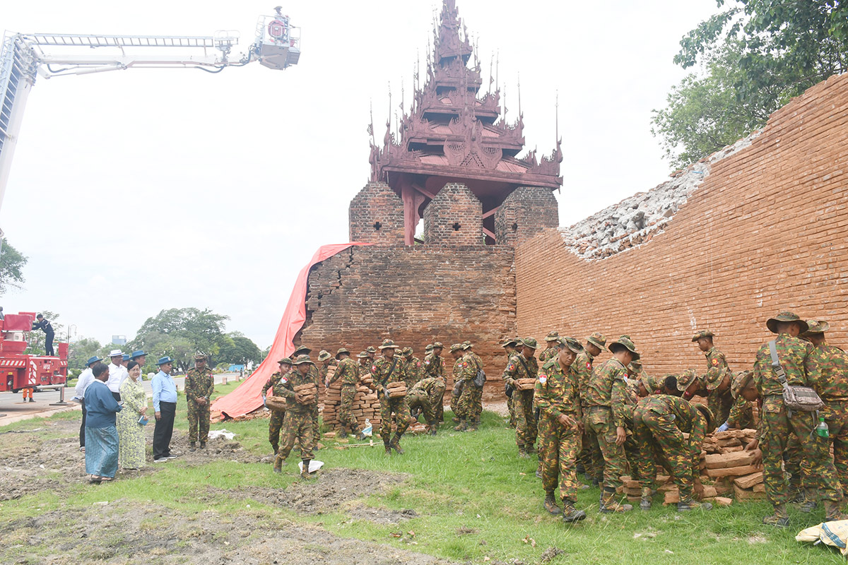On the morning of the visit, he inspected the damage to the Nanmyo Sutaungpyae Pagoda, the Mandalay Palace walls and the Mahamuni Buddha Image. They also observed repair work to broken bricks of many other religious buildings and restoration of tilted spires and wooden tiered roofs. The works are carried out by Tatmadaw personnel, Myanmar Police Force members and staff from the Department of Archaeology and the National Museum. The inspection included other affected religious landmarks such as Ananda Pagoda, Phayani Pagoda, Ayeik Mahwet Pagoda and the damaged convocation hall of the State Pariyatti Sasana University in Mandalay. The Union Minister provided instructions for the proper implementation of necessary restoration and maintenance tasks.