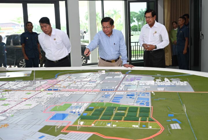 Accompanied by Council Joint Secretary General Ye Win Oo and the Commander of Yangon Command, the Senior General inspected the scale model of the layout plan of Hlinethaya Township and discussed the potential for the development of urban areas at Bayintnaung Park.
