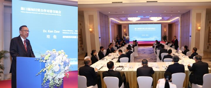 At noon, the Union minister attended the Haikou-Myanmar Economics and Trade Cooperation Exchange Meeting held at Grand Hotel Haikou and discussed Myanmar-China bilateral cooperation, investment, conditions of special economic zones of Myanmar, potential opportunities for cooperation with Hainan, the jade and jewellery sector and further cooperation with Hainan Free Trade Port.