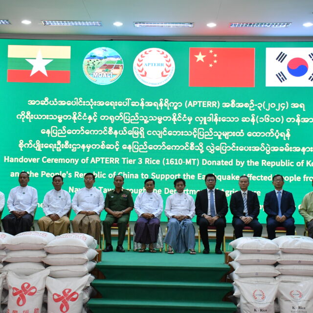 The handover ceremony of the ASEAN Plus Three Emergency Rice Reserve (APTERR) Tier 3 Rice (1610MT) donated by the Republic of Korea and the People’s Republic of China to support the quake-stricken people from Nay Pyi Taw through the Department of Agriculture took place in Nay Pyi Taw yesterday.