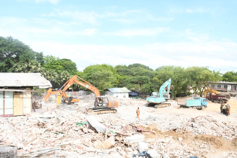 Afterwards, they inspected the demolition of dangerous and unstable buildings in both the western and eastern parts of Thirimarlar Ward in Aungmyaythazan Township using heavy machinery. They reviewed the operations and provided the required coordination and support.
