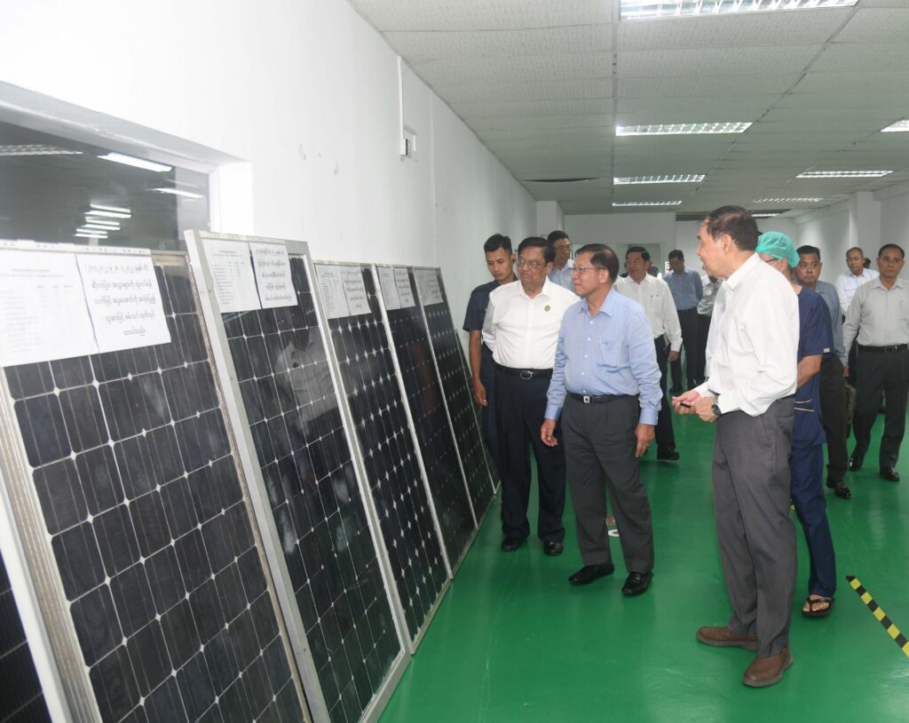 At the hall of the Solar Panel Factory of Shwe Katha Company Limited under the Electronic Accessories and Electric Motor Workshop of the No 2 Heavy Industries Enterprise, Union Minister for Industry Dr Charlie Than reported to the Senior General on facts about the Electronic Accessories and Electric Motor Workshop, the Solar Panel Factory of the No 24 Heavy Industry (Dagon), the market of solar panels, import of solar panels, generating electricity from solar power with the use of solar panels and the managing director of Shwe Katha Co Ltd on production process of solar panels, and year-wise increased production.
