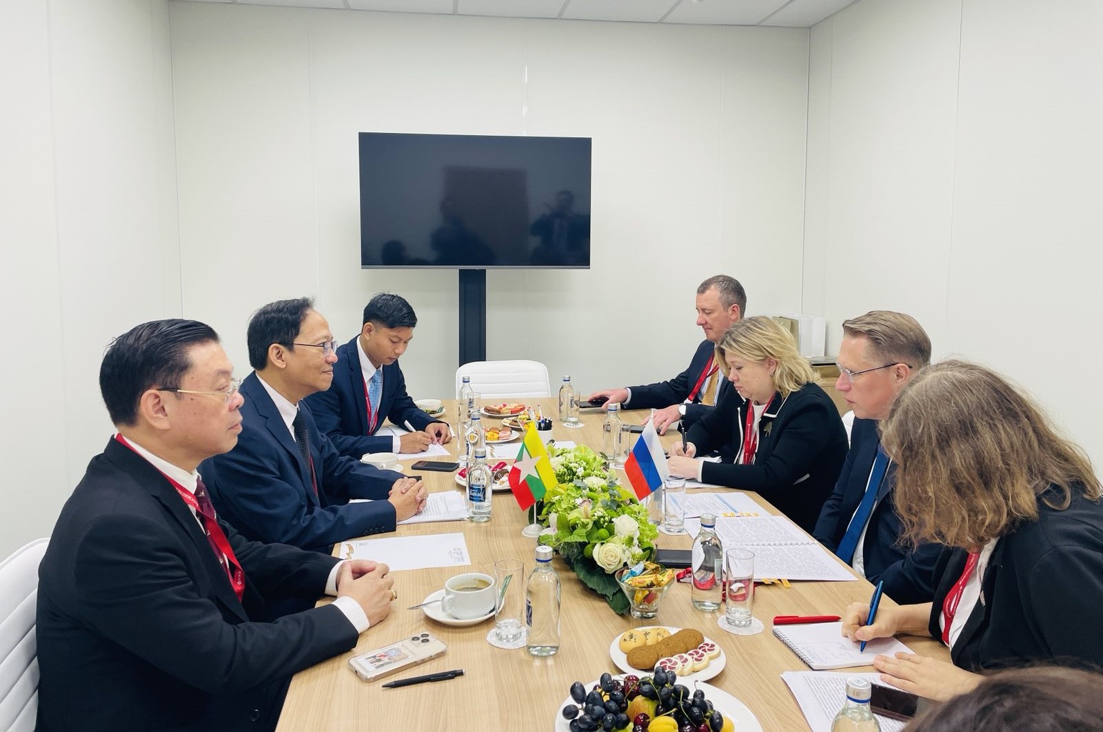 On 19 June, the Union minister received Russian Health Minister Mr Mikhail Murashko, and exchanged views on the matters contained in MoU between the two ministries signed during the visit of the Head of the State in March 2025 such as human resource development in health sectors, exchange visit for medical professionals between tow countries and training, cooperation in upgrading Taunggyi Sao San Tun Hospital, plans to sign MoU to import Russian-made medicines and medical supplies, further cooperation in radionuclide treatment and cancer treatment activities.