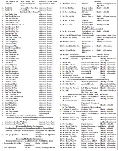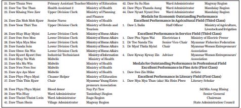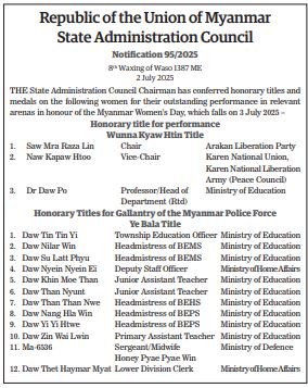 THE State Administration Council Chairman has conferred honorary titles and medals on the following women for their outstanding performance in relevant arenas in honour of the Myanmar Women’s Day, which falls on 3 July 2025 –