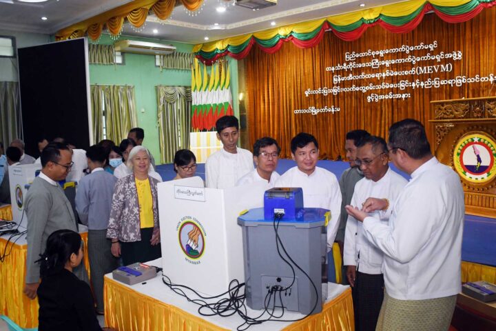 Member of the Union Election Commission U Ko Ko Lwin made a speech while Deputy Director-General U Nyi Nyi Lwin of the UEC Office explained use of the machine. The Chief Minister, the Chief Justice of the Regional High Court and regional ministers participated in the demonstration of using the machine in voting.