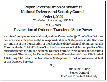 Submitted by moiuser3 on 1 August 2025 Republic of the Union of Myanmar National Defence and Security Council Order 1/2025
