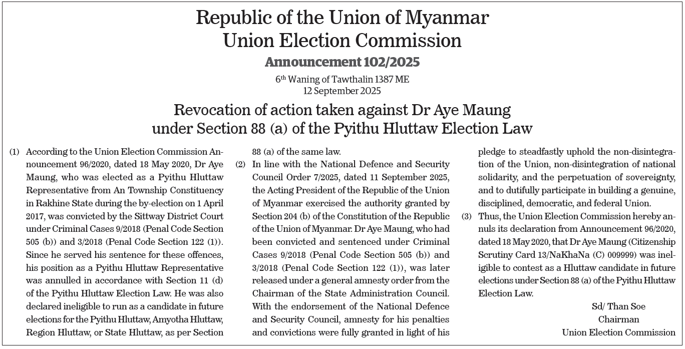 Submitted by moiuser3 on 13 September 2025 Republic of the Union of Myanmar Union Election Commission Announcement 102/2025
