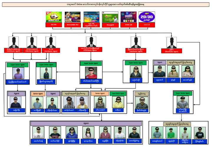 According to the confession, the offenders had to apply to be agents for the Ibet 789 Online website, 555 Mix website, Moung 556 website, Batman 688 Slot Website, Shan 234 website and 2D/3D website. They had to advertise the gambling posters on Facebook groups and Telegram groups, where they showed Viber numbers to lure the users. When the users contacted them on Viber, the agents opened accounts to gamble on websites. The more users the agents find, the more potential they will gain to be senior agents. While serving as senior agents, they can be super senior agents if they can find commissioned agents and users.