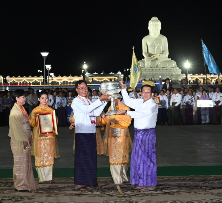 Afterwards, the Acting President and SSPC Chairman presented trophies, cash awards, and certificates of honour. The awards were given to the Nay Pyi Taw Development Committee team, which won first prize in the Nyameegyi hot-air balloon competition, the Ministry of Social Welfare, Relief and Resettlement team, which won first prize in the Seinnapan hot-air balloon competition, and the Mandalay Region Amara Shwepyi weaving team, which won first prize in the Matho-robe weaving competition.