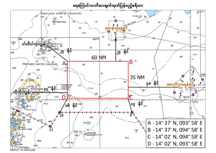 1.The naval maritime exercises will be conducted within Myanmar’s territorial waters from 7 to 8 November 2025, involving surface and aerial fire drills. The designated area for naval exercise is defined by the coordinates – Point A: Latitude 14°37’N and Longitude 93°58’E, Point B: Latitude 14°37’N and Longitude 94°58’E, Point C: Latitude 14°02’N and Longitude 94°58’E and Point D: Latitude 14°02’N and Longitude 93°58’E, and maritime and aerial warnings have been announced.