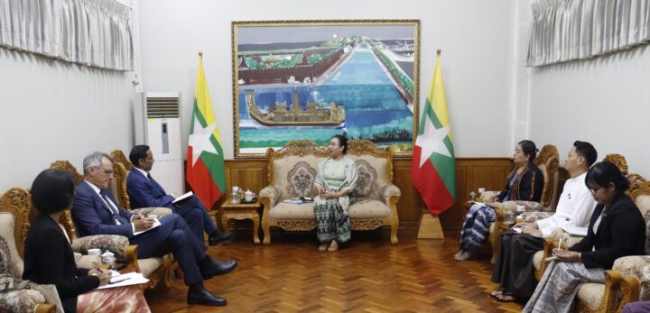 Union Minister for Investment and Foreign Economic Relations Dr Wah Wah Maung separately received Mr Samir Sudhir Wanmali, Regional Director for Asia and the Pacific of the World Food Programme (WFP), and Mr Sanjay Mathur, Asian Regional Director for the United Nations Office for Project Services (UNOPS), at the Ministry of Investment and Foreign Economic Relations, Nay Pyi Taw, yesterday.