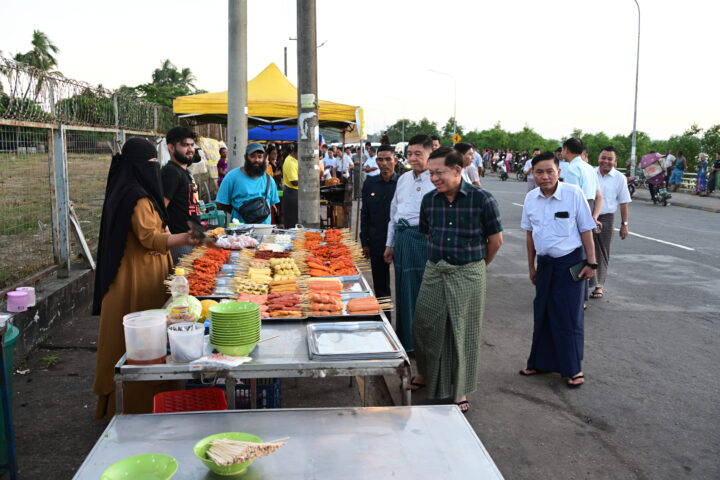 The Senior General, together with officials, viewed around selling of traditional foods and the opening of shops at the night market along the Strand Road in Mawlamyine and cordially greeted the vendors and consumers who tasted foods at the shops.