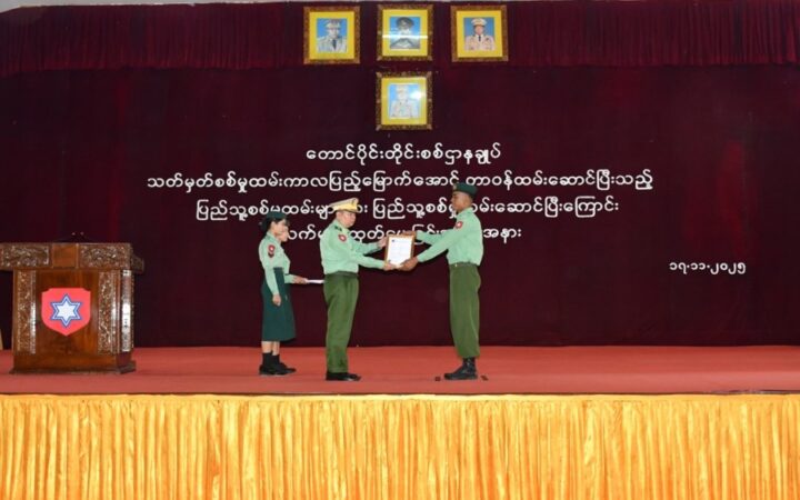 Among those serving duties, a completion certificate handover ceremony for those who have finished their designated military service period for a one-third reduction of service time was held yesterday afternoon at the Ayechanphyo Hall of the Southern Command Headquarters. Commander Maj-Gen Kyi Thike and relevant officials, and those who completed the duties, attended the event.
