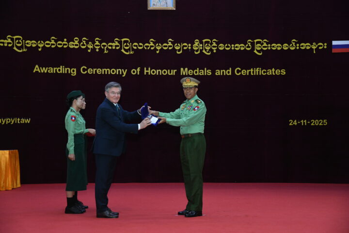 The ceremony to present the honorary medals and certificates awarded by Russia’s EMERCOM to representatives from Myanmar’s Ministry of Defence for their outstanding efforts in earthquake rescue operations was held yesterday at the Hsinphyushin Hall of the Military Transit Camp in Nay Pyi Taw.